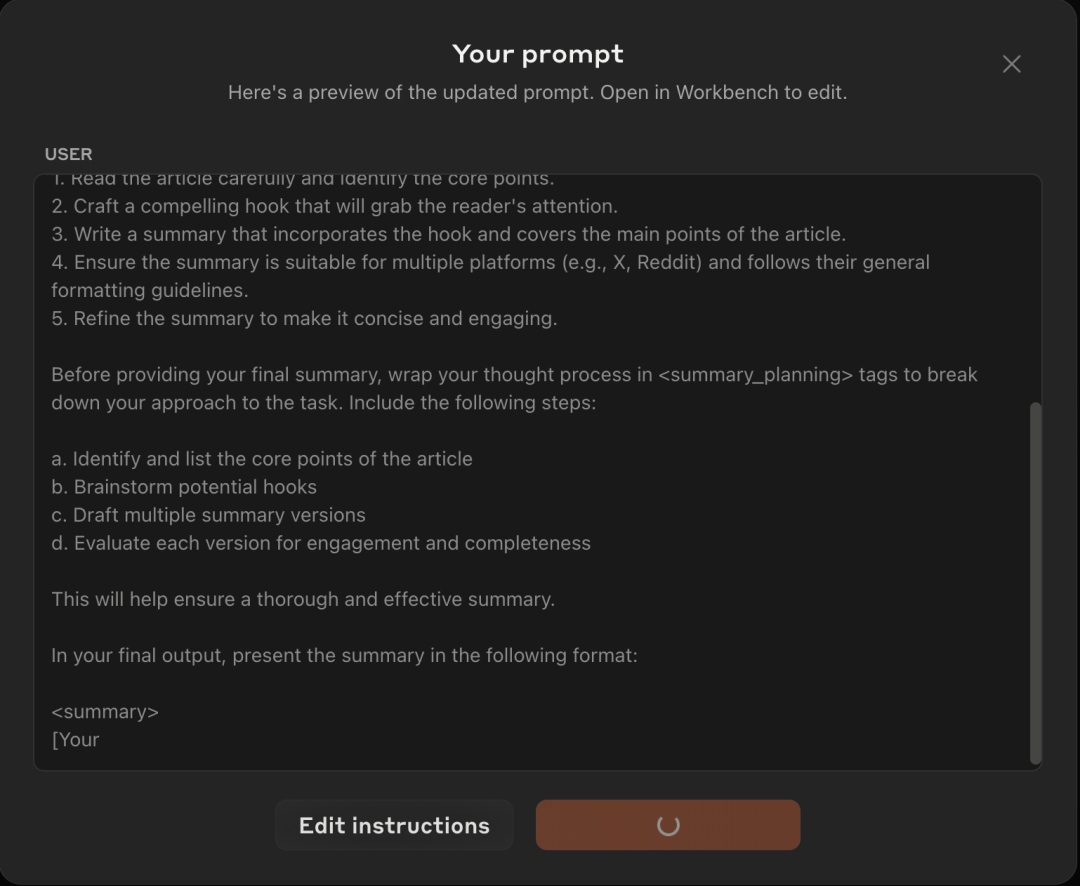 生成到最后一步时,当完整提示语还没有生成好,一定一定一定不要点击Open in Workbench,点了基本上是百分百会卡住。这时候要是刷新的话,钱是扣了,但得到提示语是个半成品。