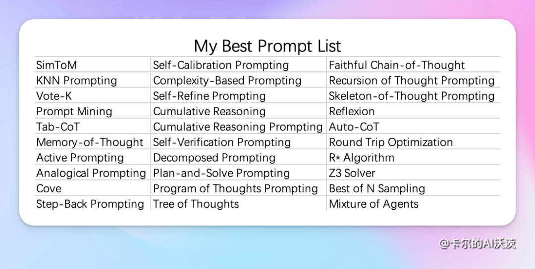 除了火出圈的 Thinking-Claude、SuperPrompt、CO-STAR,以及各大模型和 AI 产品的 System Prompt 外,我还挑选出了论文领域和开源项目都在高频使用的技巧:(排名不分先后)