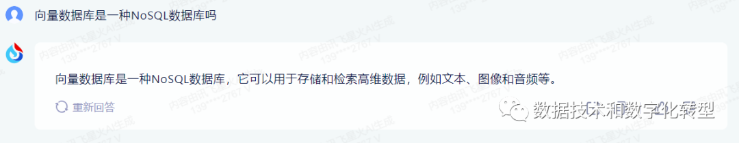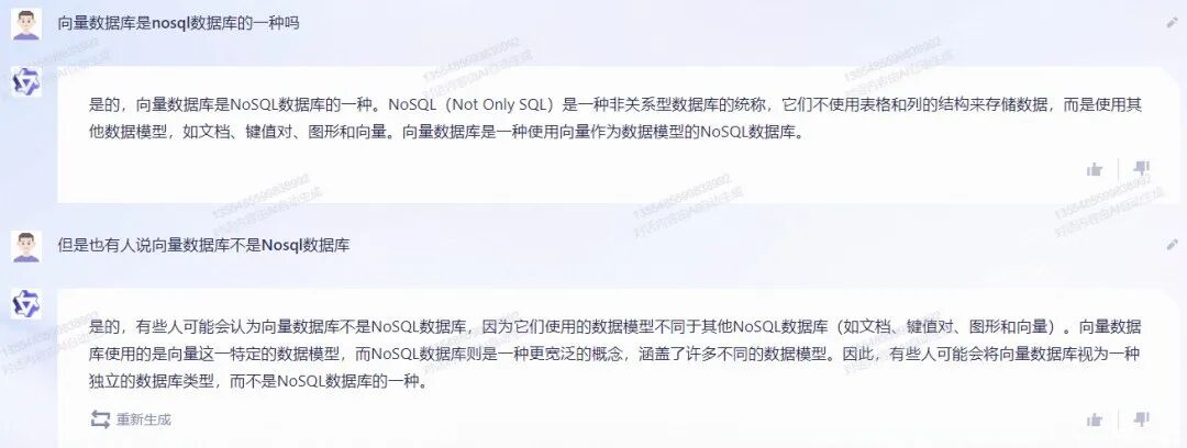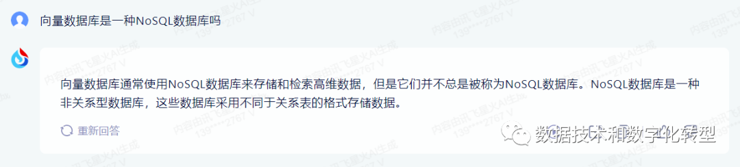 讯飞星火:之前没有测试这个平台,此次提问,第一次得到“向量数据库NoSQL一种”的回答,但答案过于简单。让其重新生成回答后,没有禁住考验,给出了相反的答案。(但其他两个国产大模型在“重新生成”这个功能上的表现更差,不管点多少次,生成内容都是一模一样的...)