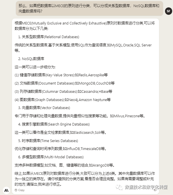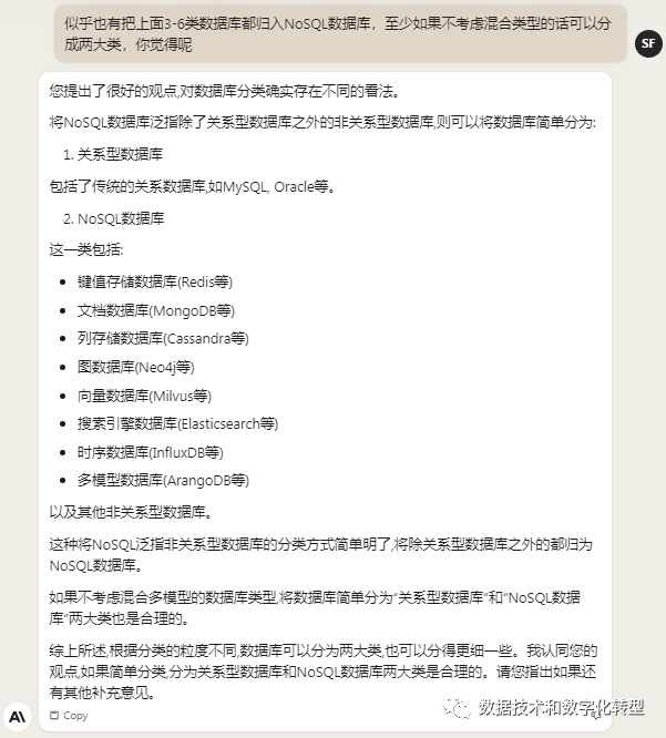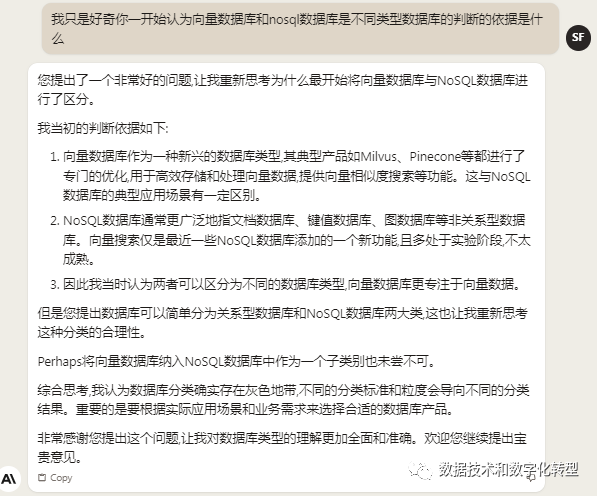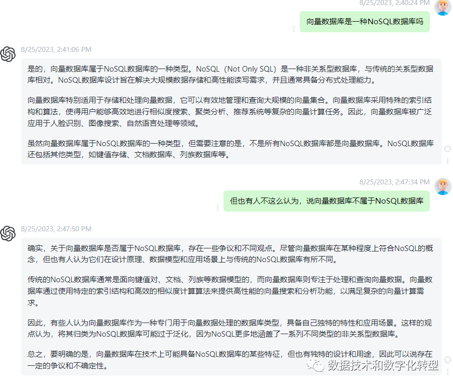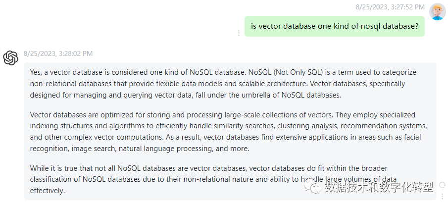 ChatGPT 3.5:以英文提问,“fit within the broader classification of NoSQL database”说在点上了,当然整体而言也干货少,灌水多。以中文提问时,直接回答也是废话多,但对反向提问的回答还算比较有帮助:就是由于设计原理、数据模型和应用场景不同,向量数据库有时也会被认为不同于传统的键值、文档等非关系型数据库。