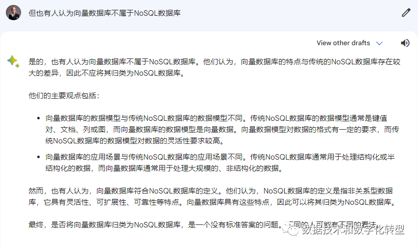 Bard:我个人认为是三款国外产品中表现最好的,在给出肯定回答的同时还以列表形式清楚说明了两者差异,对反向问题的回答也前后逻辑一致,基本观点是向量数据库是一种特殊NoSQL,同时也表示反对意见有其自身的逻辑基础。