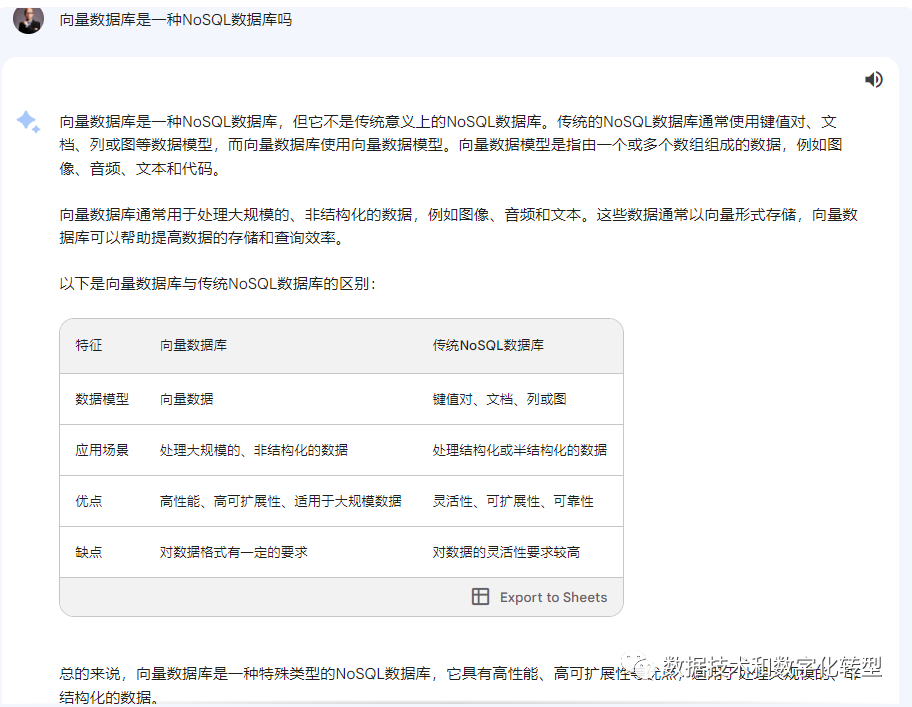 总结一下,我认为基本可以参考Bard来人工生成本文主旨问题的答案:由于符合NoSQL数据库“非关系型”分类的基本定义,向量数据库可视为一种特殊类型的NoSQL数据库,但由于设计原理、使用场景的确存在一定的差异,特别是面向的数据结构不同,有部分人从约定俗成的角度认为,NoSQL仅关于键值、文档、列、图等数据类型,因此存储和处理向量数据的数据库不算NoSQL。 从工具评价的角度看,AIGC为研究提效的前景还是很明确的。目前在研究理解以及对比技术概念、原理和趋势的时候,AIGC工具在一定程度上已经可以作为与搜索引擎等效的工具,特别是在业界(训练数据中)已有基本共识的问题上,各家产品大致都已能有效降低知识获取的门槛、充当比较靠谱的专家,比起原有的搜索引擎工具而言对入门者更为友好。对于复杂问题辨析等场景,则还是需要研究者具备一定的先验知识和逻辑推理能力。相信配合私域数据及知识图谱等资源和技术,未来AIGC能在企业知识管理和知识服务场景中有更有效和普遍的应用。 |