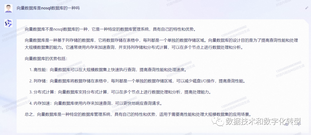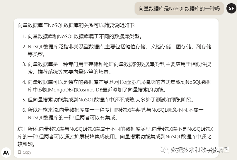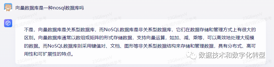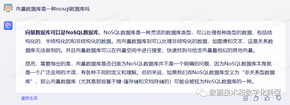 在上一篇《向量数据库漫谈》结尾留了两个小问题,这次先来说第一个:向量数据库到底算不算NoSQL数据库。关心结论的可直接拖到底部,感兴趣过程以及国内外AIGC产品对比的可以仔细看看中间的问答截图 - 是的,本文还考虑过另一个题目“国内外六大AIGC平台横评:以向量数据库定义研究为例”。 出乎我的意料,貌似很简单的问题,在搜索引擎上竟不太容易找到直接的答案。事实上,有趣的是中文互联网和英文互联网对于这个问题的解释是正相反的: