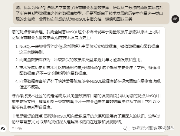 Claude:Claude在准确性和简洁度上虽然比不过Bard,但跟牠对话的确更像和一个真人交流,当然目前看来代价还是话有点密。从下面对话链看到,较其他平台而言,Claude每一次生成的内容都更详尽且相关。尽管Claude在开始也认为向量数据库不属于NoSQL,但由于其内容生成质量较高,因而更容易与其形成互动,并能逐步形成兼有正反观点、比较全面的讨论。