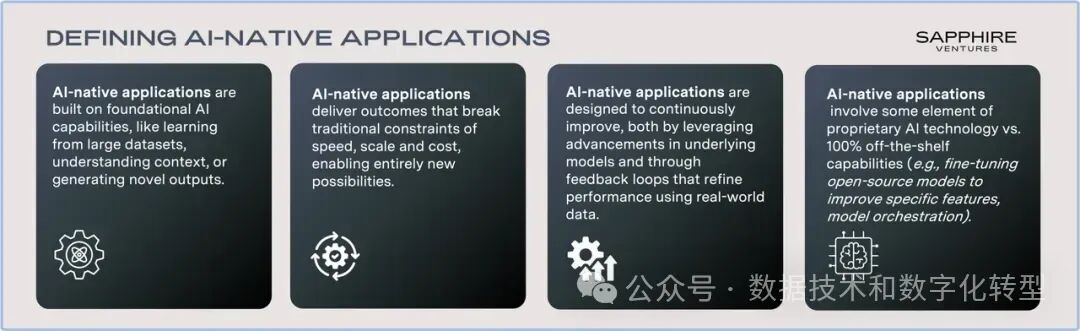 我总结为“3+1”要素:即,技术内核(大模型GenAI/小模型DecisionAI)+ 价值(突破性优于传统生产力)+ 自主泛化(基于数据反馈的自主提升)+ 专有能力(工程/专业知识DSK)。 具体而言,四个要素原文解读如下. 建立在基础 AI 能力之上,包括从大规模数据集中学习、理解上下文或生成新颖输出的能力。 .能够突破传统速度、规模和成本的限制,开创全新的可能性。 .具备持续改进的能力,既可以利用底层模型的进步,也可以通过真实世界数据的反馈循环来提升性能。 .拥有一定程度的专有 AI 技术,而不是完全依赖现成的解决方案(例如,针对特定功能微调开源模型、模型编排等)。