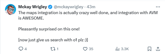 这次的地图整合做得真的非常出色,而且与AVM的整合非常棒。这真是个令人惊喜的功能![现在只需要给我们o1复杂度的搜索功能就好了 ]