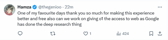 这是我最喜欢的直播日之一,非常感谢OpenAI让搜索体验变得更好而且免费。能否努力让o1也能访问网络,就像Google做的那样?