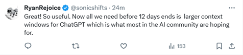太好了!非常有用的功能。在接下来的12天,我们只需要ChatGPT的上下文窗口更大一些,这也是大多数AI社区成员所期望的。