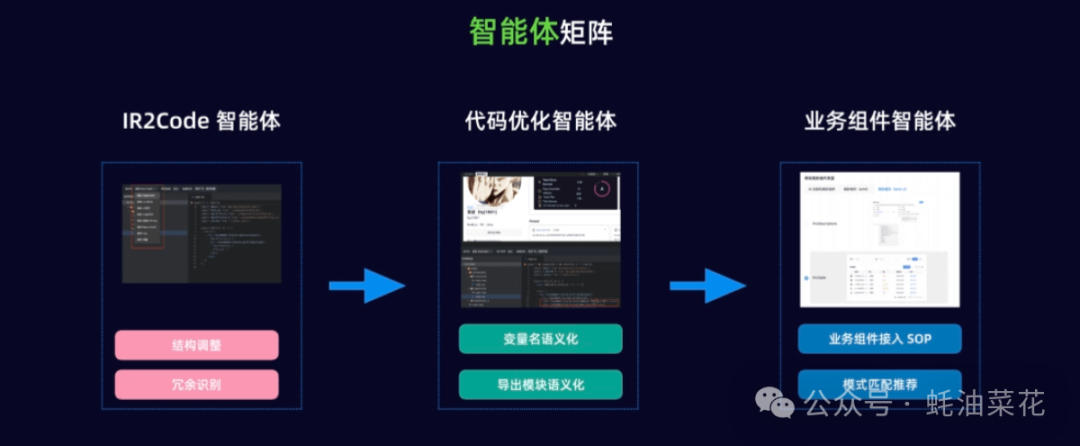 • 智能代码生成:基于页面语法结构的布局树作为上下文配合模型矩阵完成高可读性和可维护性的业务代码生成。