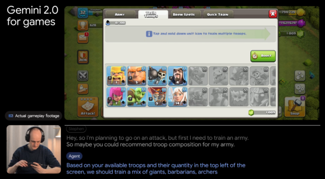 “编程助手”Jules能够作为自主代理直接集成到GitHub的工作流程系统中,分析复杂的代码库,跨多个文件实施修复,并准备详细的拉取请求,无需持续的人工监督;而在游戏《部落冲突》演示中,谷歌AI Agent不仅能够向玩家介绍兵种特性,给出组合建议,还可以在Reddit检索信息,为玩家提供角色选择建议。