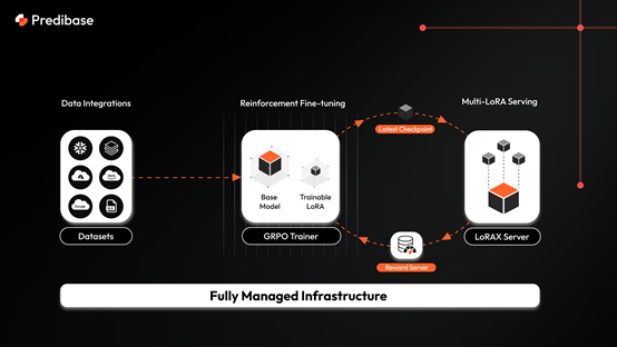 在训练与推理效率方面,传统方法通常需在本地环境中进行,对硬件资源要求高,且需手动管理训练和部署过程。 而Predibase提供的RFT平台是完全托管的无服务器平台,用户无需管理底层服务器或基础设施,平台自动处理训练、部署和推理全过程,大大降低了开发和运维复杂性。此外,RFT利用多LoRA框架和流式微批处理技术,实现了高效的训练和推理。