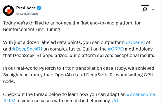 今天凌晨,知名大模型训练、开发平台Predibase发布了,首个端到端强化微调平台(RFT)。