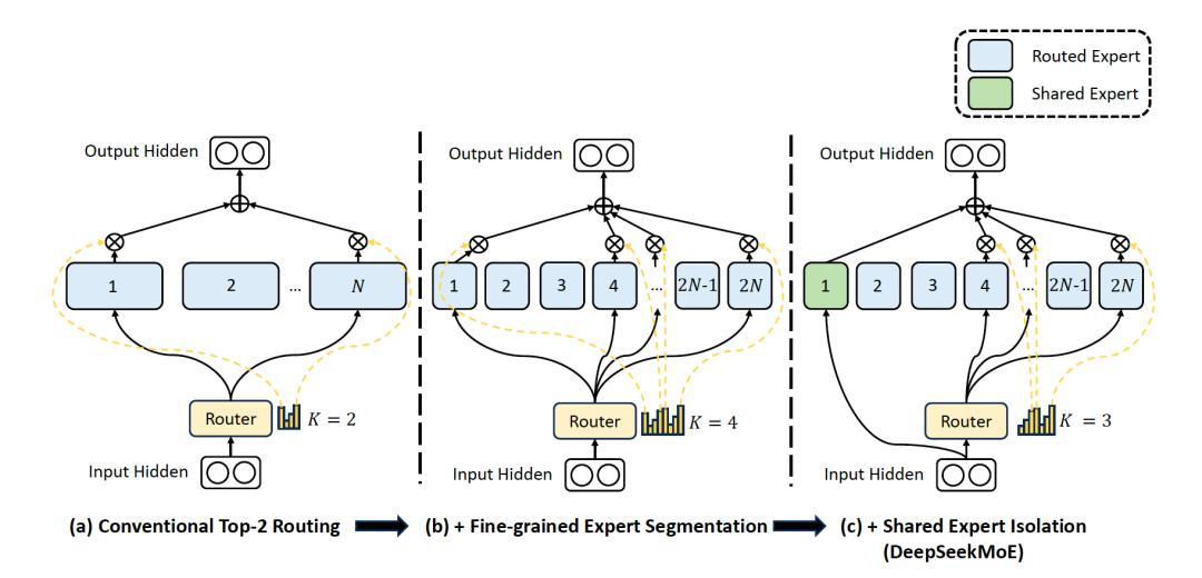 往往会带来负载均衡问题,即专家工作量的不均衡分布,部分专家频繁更新,其它专家很少更新,大量研究专注于解决负载均衡问题。 DeepSeek的MoE结构: DeepSeekMoE DeepSeek-R1: 1个共享的专家+63个路由的专家,每个专家是标准FFN的1/4大小.