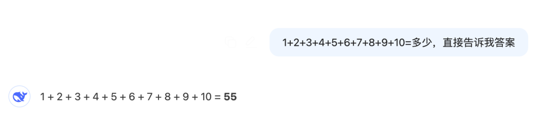 一个例子,问:1+2+3+4+5+6+7+8+9+10=多少,直接告诉我答案