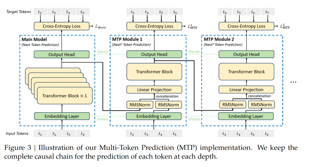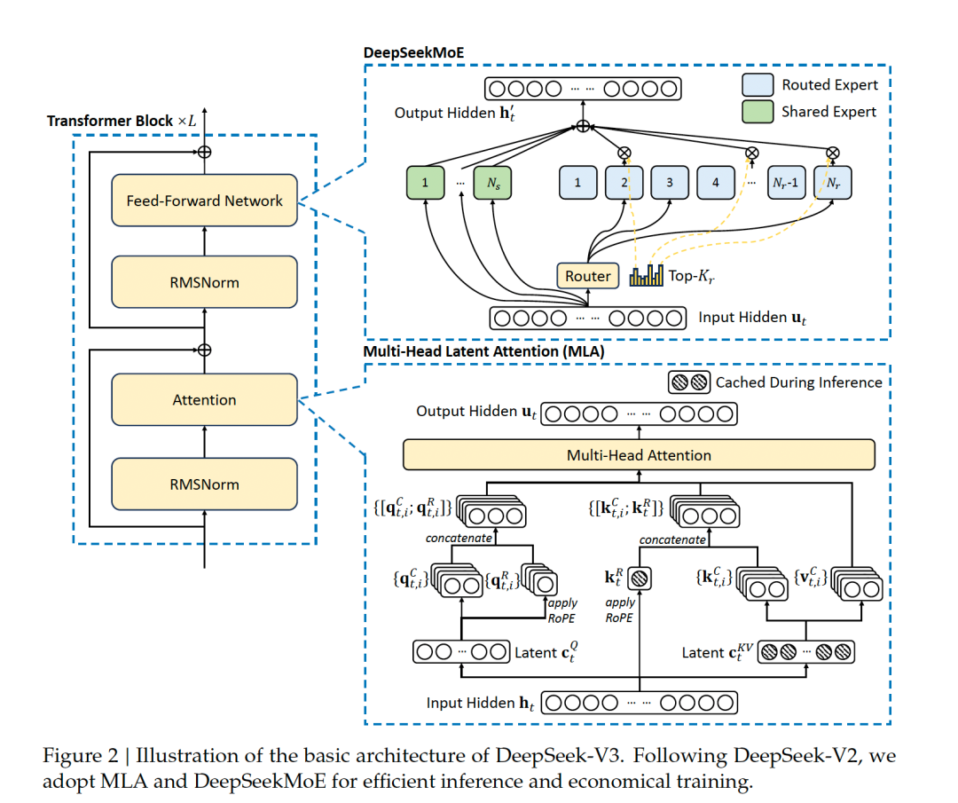 参考: DeepSeek-v3技术文档 [8] DeepSeekMoE: 混合专家模型,推理时,仅动态激活部分专家(37B 参数),而非全模型参数(671B 参数),减少计算负担。 引入无辅助损失的自然负载均衡来解决不同专家的负载均衡问题。 采用MLA (Multi-Head Latent Attention)架构,扩展了传统的多头注意力机制,引入潜向量(latent variables),可以动态调整注意力机制,捕捉任务中不同的隐含语义。在训练中减少内存和计算开销,在推理中降低KV缓存占用空间,把显存占用降为MHA架构的5%~13%。 采用多步token预测 MTP(Multi-Token Prediction)。一般LLM一次生成1个token,DeepSeek在特定场景下能同时预测多个token,来提高信号密度。一方面能够减少上下文漂移、逻辑更连贯,也能减少一些重复中间步骤,在数学、代码和文本摘要场景能提升效率。