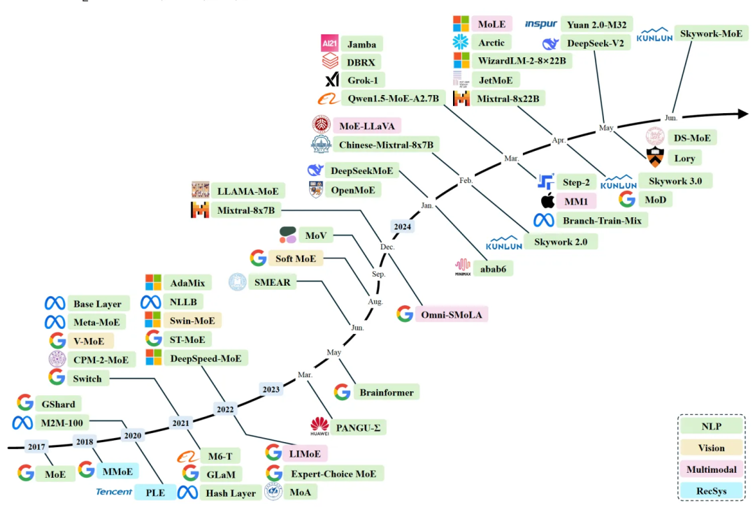 2.5.2.Mixture of Experts (MoE) 混合专家模型MoE在NLP、CV、多模态和推荐系统中有广泛的应用(时间线上面的开源,下面的闭源)。