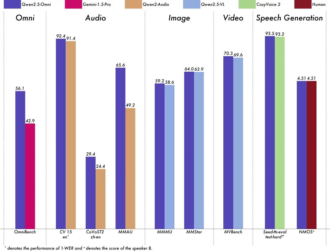 在需要多模态的 OmniBench 上超过 Gemini 1.5 pro 达到最佳性能,在单模态任务中,音频超过了 Qwen2-Audio、图像超过 Qwen2.5 VL、在 NMOS (语音合成音频的自然度评估)上达到人类口语水平。
