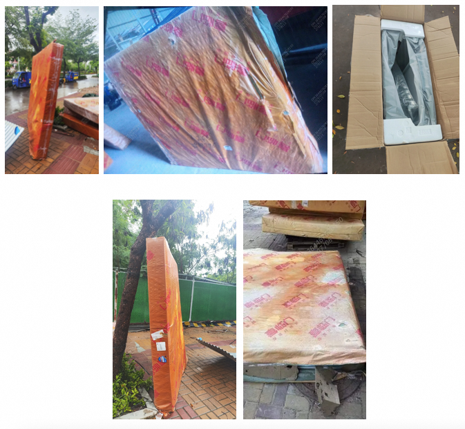 问题一是对易混图片的识别准确率很低,这类易混图片的特点是数量一般在8张以上,其中大部分是商品完好的图片或者是外包装等和商品无关的图片,这样的图片是无价值的,对定损没有帮助,真正有价值的能暴露商品破损情况的图片只有1-2张,比如下面这个床垫的例子:前面4张图片几乎看不出床垫有任何损坏的地方,真正暴露问题的在最后一张图片(床垫内部破损),原因在于上传者在拍摄图片时没有着重拍破损部位的全景图,这种情况下大模型会给出商品无损的判定结果,不符合预期;