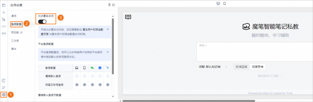2)在页面左下角选择设置 > 登录配置,打开允许匿名访问。