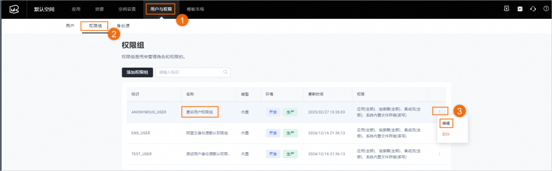 1)登录魔笔控制台,选择用户与权限 > 权限组,在匿名用户权限组中选择编辑。