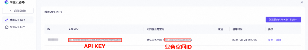 4. 复制API KEY和对应的业务空间ID。(复制完毕后,请仔细核对内容准确,确保没有多余的符号,例如多余的空格)