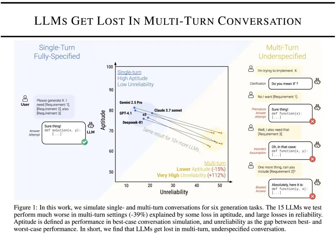 这篇论文指出,LLMs在多轮对话环境下的表现远不如单轮对话,平均性能下降了35%。很好理解,单轮正确率假设为95%,那么5轮的正确率就仅剩73%。