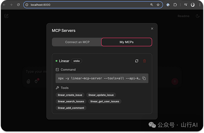 当你从 GitHub 获取上述源代码后,运行应用并在 Chainlit 的界面中输入以下 MCP 启动命令:npx -y linear-mcp-server --tools=all --api-key=lin_api_your_linear_API_Key你就可以在界面中创建或更新 Linear 的 问题(Issues) 和 项目(Projects)。