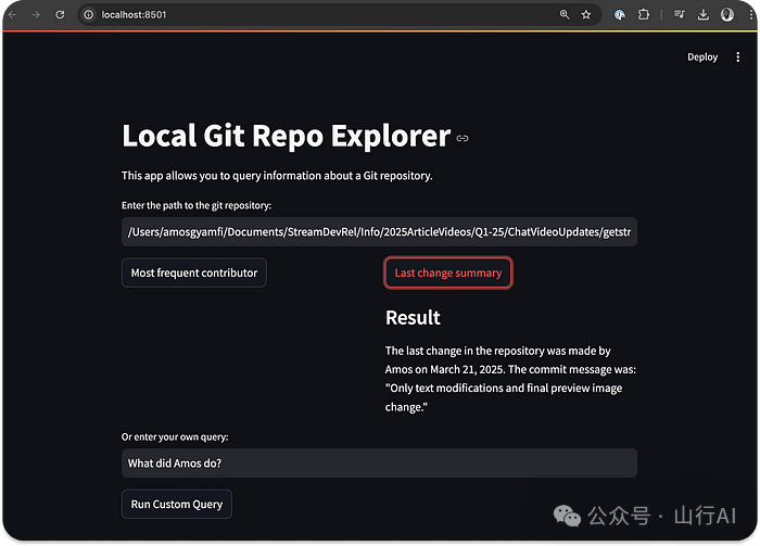 withcol2:ifst.button("最近提交摘要"): query ="Summarize the last change in the repository." run_query(directory_path, query)
