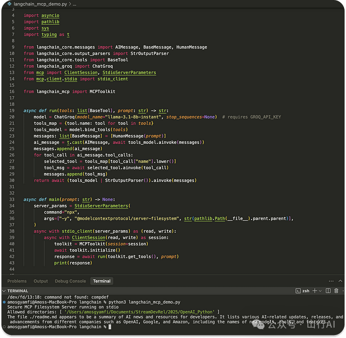 LangChain已支持通过工具调用(Tool Calling)方式接入MCP,这项支持允许你通过 Python 函数配置,连接不同的 MCP 服务器并检索工具,用于在 AI 项目中执行各类任务,下方示例代码展示了如何连接到一个安全的 MCP 文件系统服务器,使得大型语言模型(LLM)能够准确回答关于你提供的任意文件的问题。