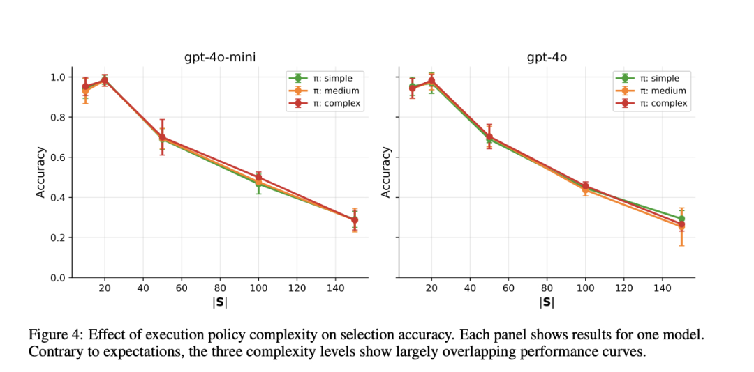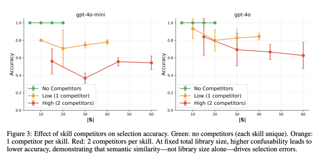 [Figure 3: 技能竞争者对选择准确率的影响]无竞争者时(绿色),即使|S|=20准确率仍为100%;1个竞争者(橙色)导致准确率下降7-30%;2个竞争者(红色)导致下降17-63%。 这证明了语义结构决定选择难度,而非单纯的库规模。在相同|S|=20时,用基础-竞争者对替换独特技能会导致18-30%的准确率下降。 指令复杂度的影响出乎意料 论文测试了三种执行策略复杂度(简单约30 token、中等约100 token、复杂约300 token)对选择准确率的影响。