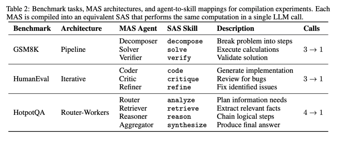 [Table 2: 基准任务、MAS架构和agent到技能的映射]每个MAS被编译为等效的SAS,在单次LLM调用中执行相同计算。GSM8K使用分解器、求解器、验证器三个agent;HumanEval使用编码器、评论器、优化器;HotpotQA使用路由器、检索器、推理器、聚合器。