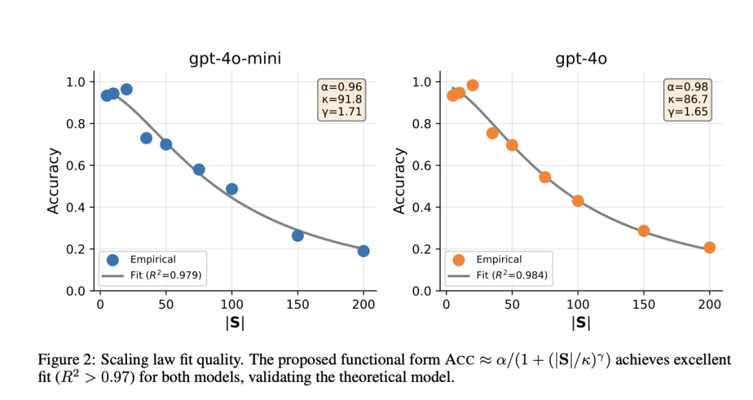 [Figure 2: 扩展定律拟合质量]在GPT-4o-mini和GPT-4o上,提出的函数形式ACC ≈ α/(1+(|S|/κ)^γ)实现了优异拟合(R²>0.97)。GPT-4o-mini的拟合参数为α=0.96、κ=91.8、γ=1.71;GPT-4o为α=0.98、κ=86.7、γ=1.65。 实验结果显示:在小规模(|S|≤20)时,准确率保持在95%以上;但在|S|=50-100附近急剧下降,到|S|=200时降至约20%。衰减率γ>1表明超过容量阈值后的衰退速度快于线性。 语义混淆才是罪魁祸首 论文设计了控制实验,为每个基础技能生成0、1或2个"竞争者"技能——描述相似但操作不同。