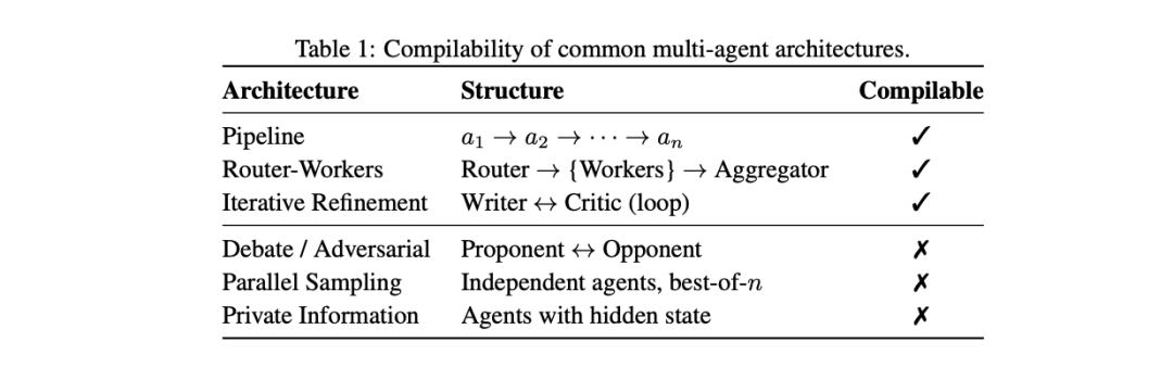 [Table 1: 常见多agent架构的可编译性]流水线架构、路由-工作者架构、迭代优化架构可编译;辩论/对抗架构、并行采样、私有信息架构不可编译。 编译效率:token减少54%,延迟减少50% 论文在三个基准任务上验证了编译效率:GSM8K(数学推理)、HumanEval(代码生成)、HotpotQA(多跳问答)。