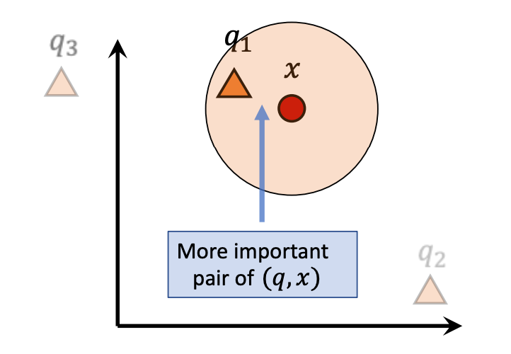 为什么要给平行分量施以更大的penalty呢?首先这里假设x是q1的近邻的话,那么x和q1的方向是接近的,所以x的平行分量可以近似认为和q1也是平行的,那么这个平行分量会让误差增大。