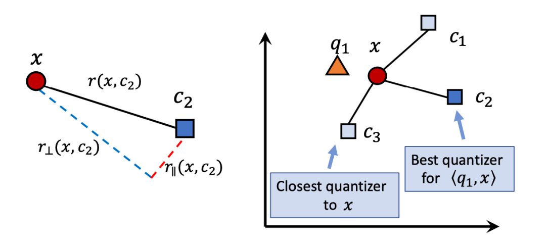 但现在有一个问题是这个weight是query aware的,相当于我们知道query以后才能算出这个loss。 所以需要做一些假设和合理转化把这个q给消掉,帮助我们在离线阶段去构建索引。 论文中把误差分解成与平行的分量以及垂直分量,并且应该给平行分量施以更大的penalty。Loss用下式表示,