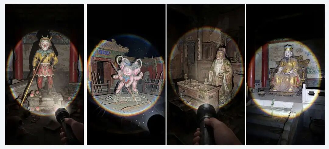 “提示词:【参考图】第一人称视角,POV 视角,一只手拿着一个手电筒,手电筒模拟聚光灯光效,手电筒的灯光呈圆形照亮,光圈边缘有自然模糊的色散,光效照亮场景,没有被手电筒照亮的地方是昏暗的,聚光灯对准远处的场景。