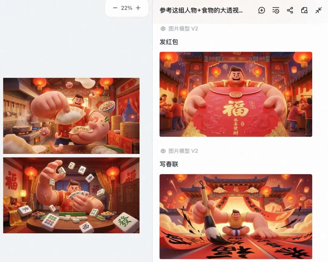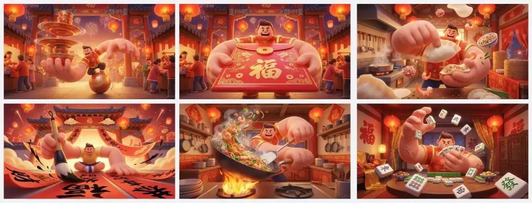 “提示词:继续延续此风格,生成 4 组春节活动类的,比如写春联,打麻将,包饺子等。