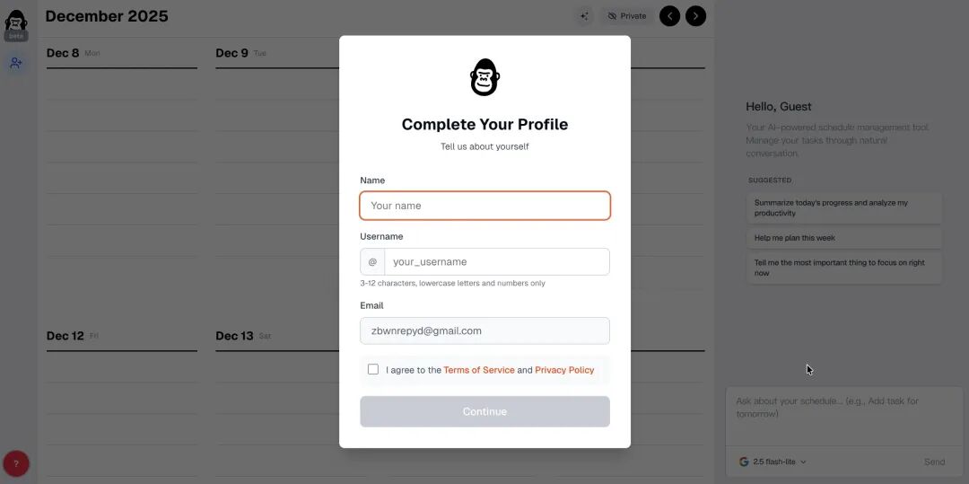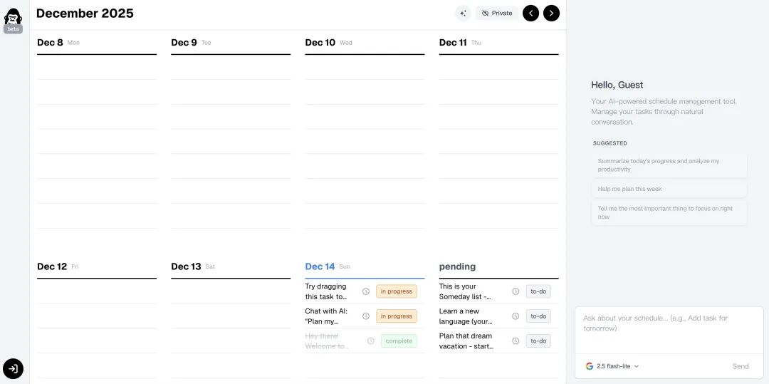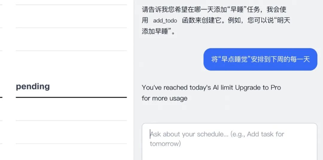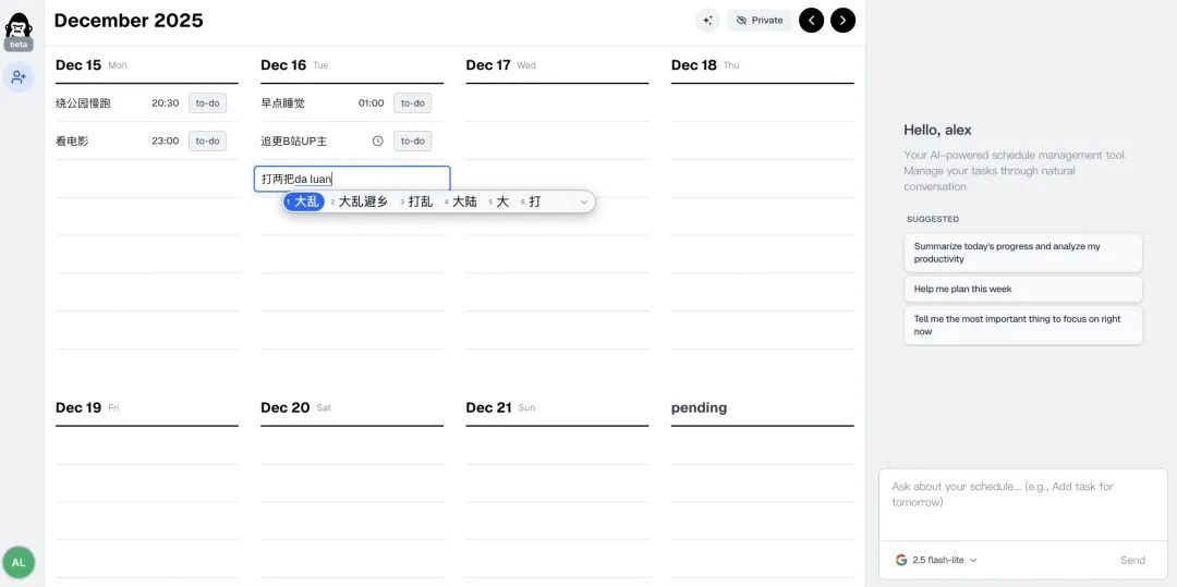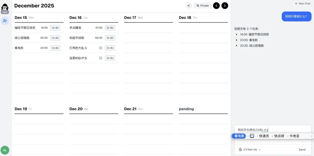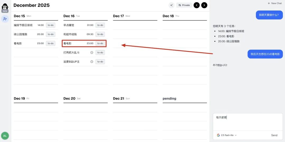 右边对话框基于Gemini2.5flash,可以对todo日历内容进行交互。这时候AI会将刚刚“pending”区未决定的工作统筹纳入考虑安排。