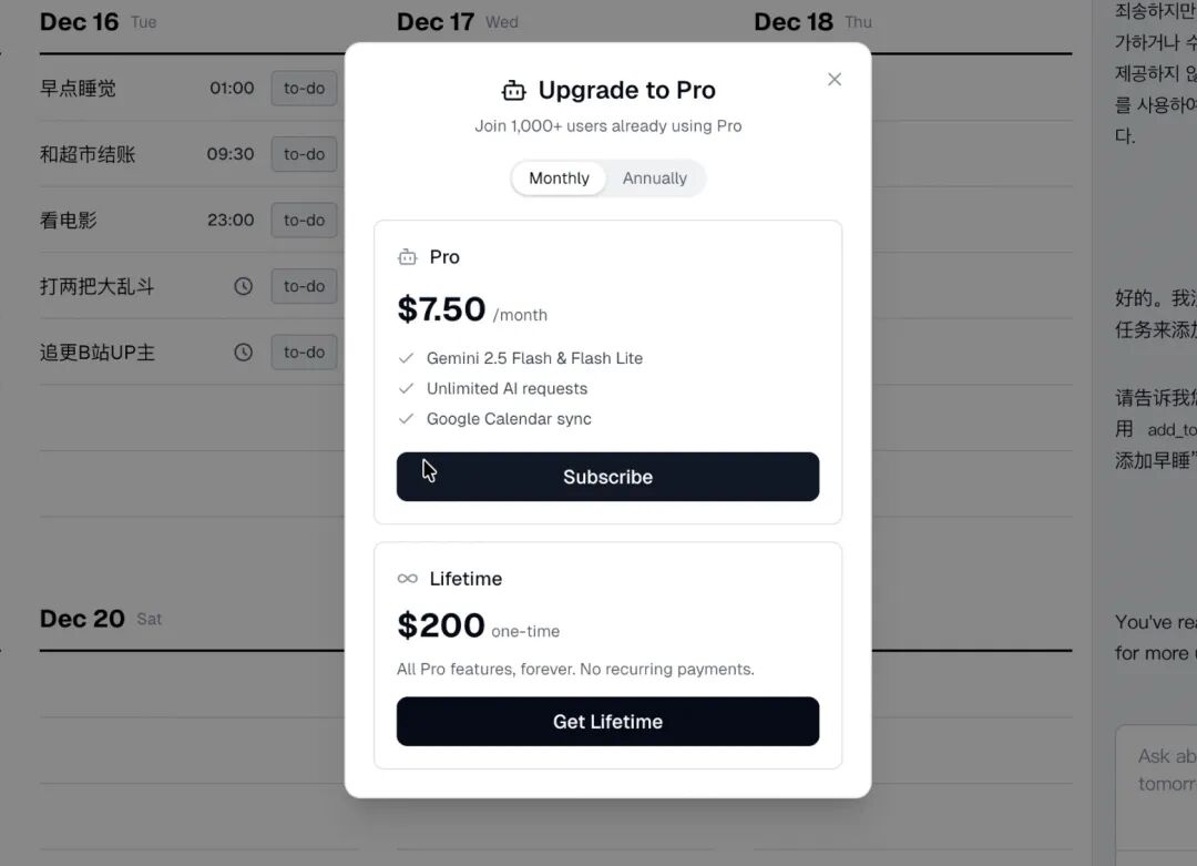 价格不便宜,人民币50左右一个月。但是Gemini Flash的推理成本很低,因此相较于Sunsama等高端竞品,这个定价其实走的是“低端颠覆”策略。