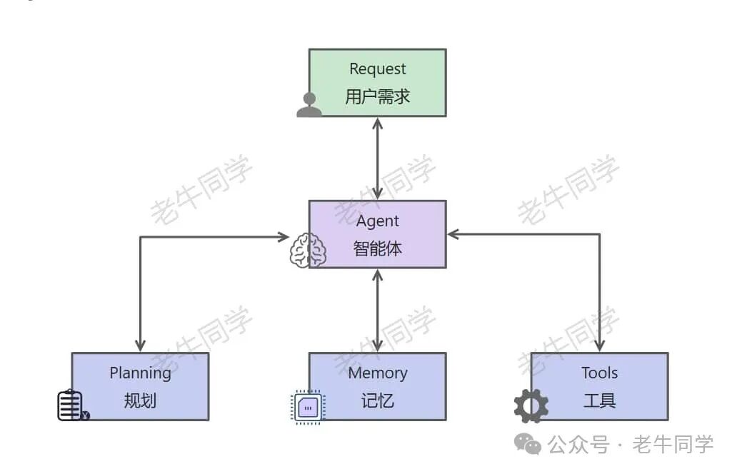 假如我们有一个基于大模型的程序,它能准确地理解我们的需求内涵,然后进一步把需求拆分成小任务,最终组织整个任务的流程和依赖,并执行达成我们的需求目标。那么这个应用就是我们常说的大模型Agent(或者叫智能体):大模型 Agent 是基于大语音模型(LLM)之上构建的、具备环境感知自主理解决策制定执行能力的智能体。