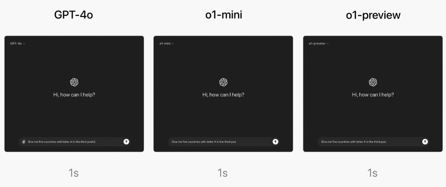 在速度层面,OpenAI 比较了 GPT-4o、o1-mini 和 o1-preview 对一个单词推理问题的回答。结果显示,GPT-4o 回答不正确,而 o1-mini 和 o1-preview 均回答正确,并且 o1-mini 得出答案的速度快了大约 3-5 倍。