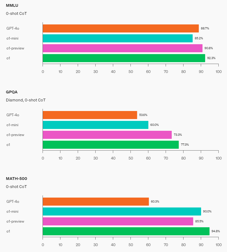 STEM:在一些需要推理的学术基准上,例如 GPQA(科学)和 MATH-500,o1-mini 的表现优于 GPT-4o。o1-mini 在 MMLU 等任务上的表现则不如 GPT-4o,并且由于缺乏广泛的世界知识而在 GPQA 基准上落后于 o1-preview。