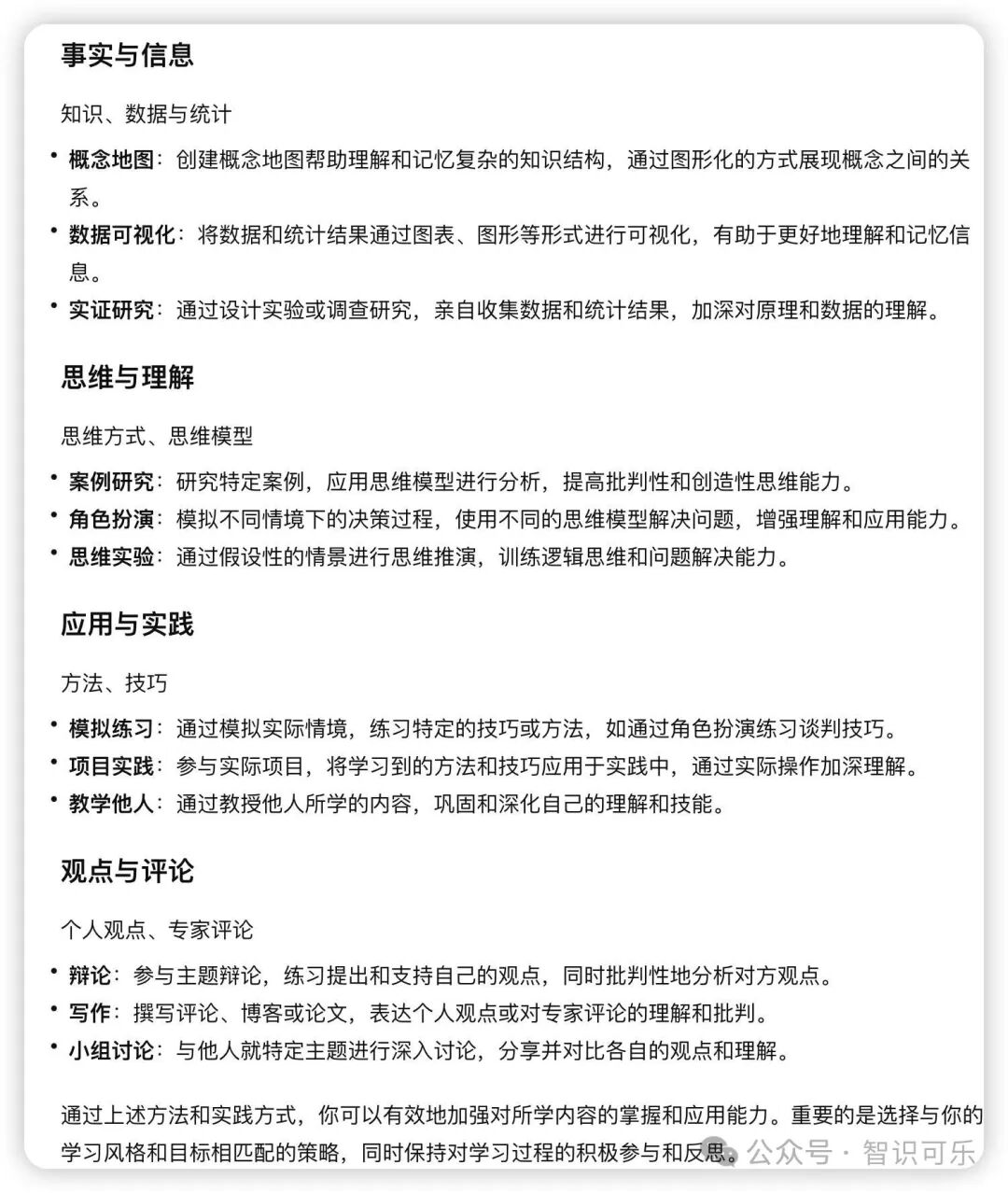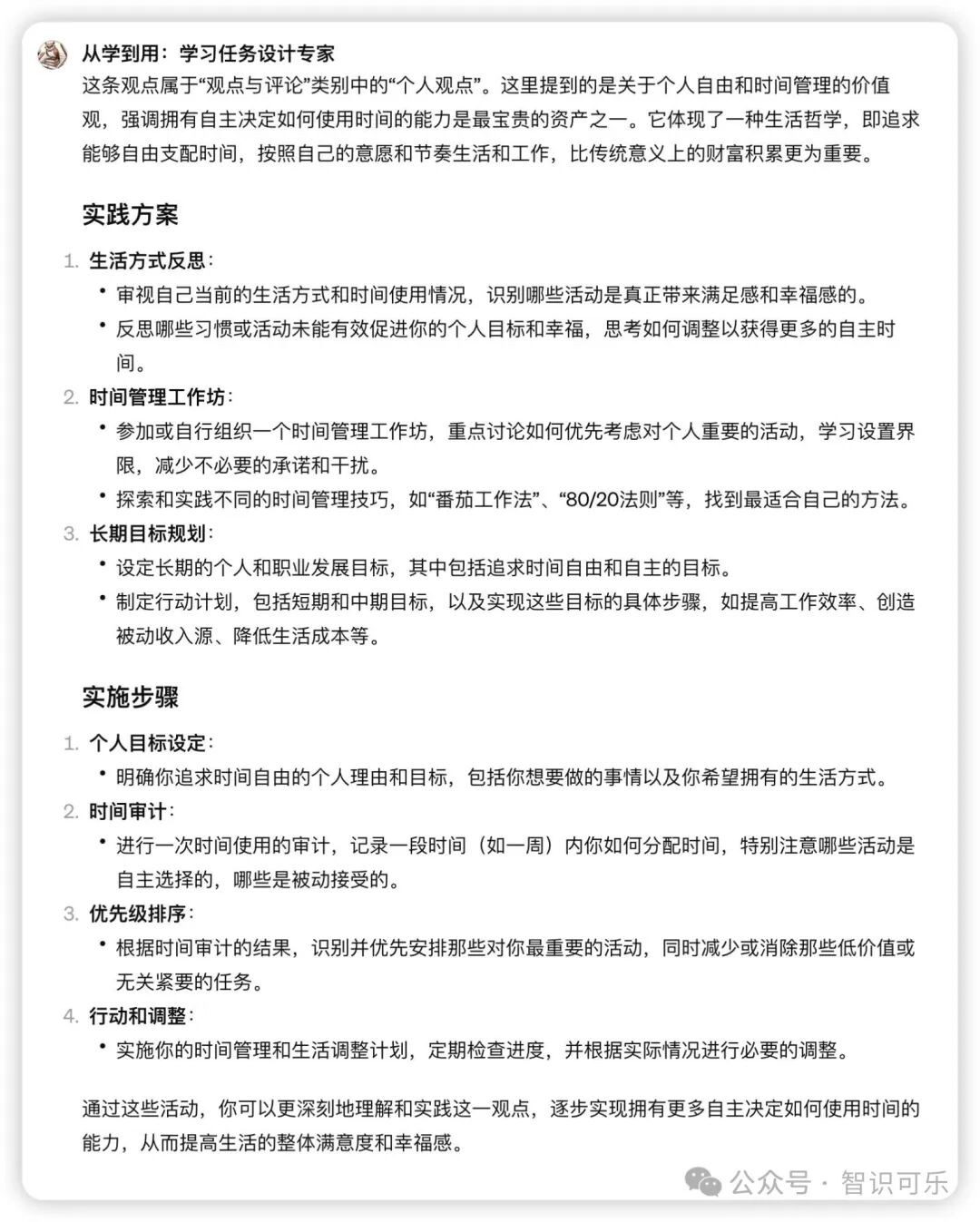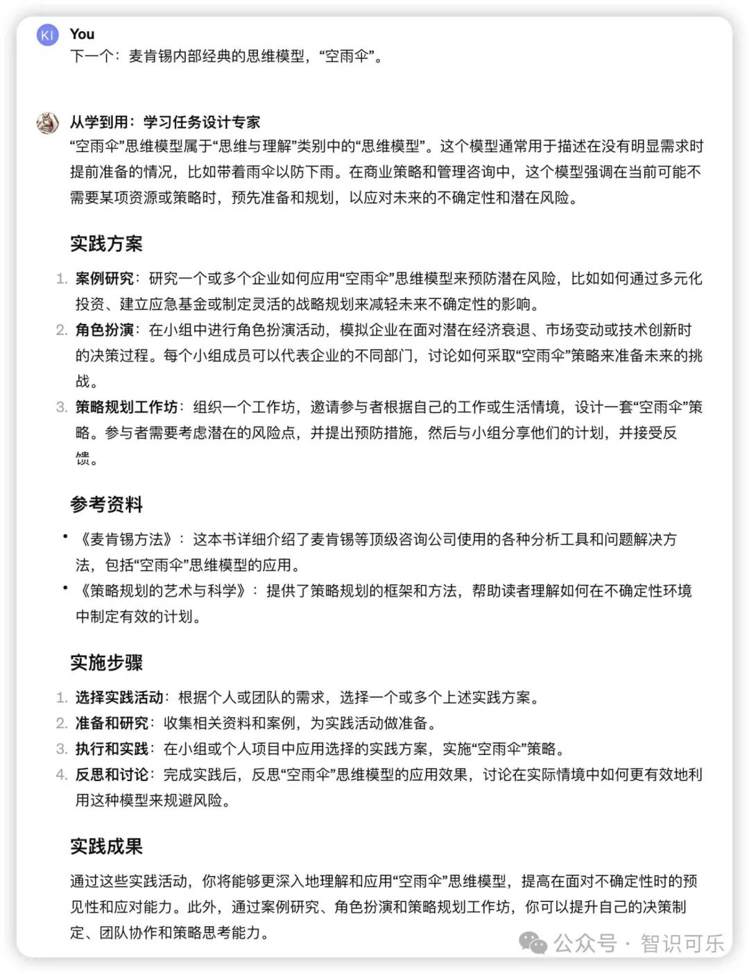 ChatGPT对于每一种“新知”都提供了实践策略方案。我挑不出毛病,已经非常周全了。