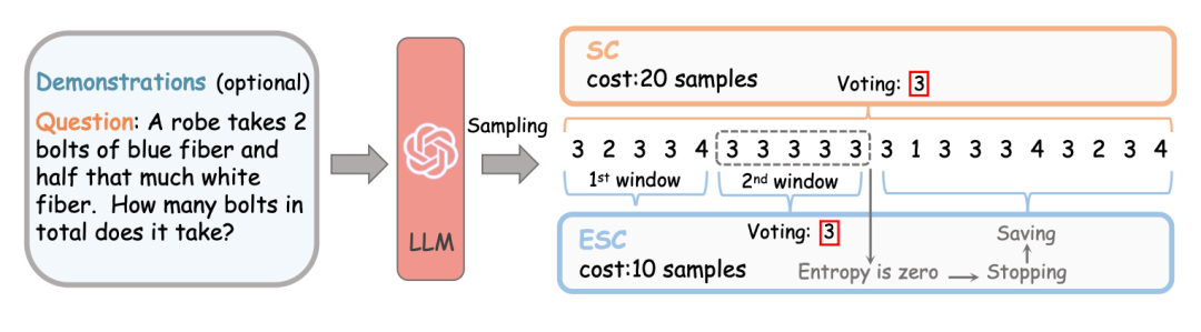 图 2 : ESC 与原始 SC 过程对比 如图展示 ESC 与原始 SC 的完整过程对比。我们将大采样量(在本例中等于 20)分成几个连续的小窗口(在本例中为 5),当一个窗口内的答案都相同时停止采样,即预测答案分布的熵值为零。 2.1 自洽性方法分析 自洽性方法的核心思想在于,对于一个复杂问题,通常允许有多种推理思路,这些思路最终都能导向相同的正确答案。基于此,在采样量为 下的投票过程可以表述为:  其中 表示在个采样实例中,模型的预测结果为的频率。根据大数定律,当趋近于无限时,采样结果的分布将逼近模型预测的真实分布结果 。进一步地,我们可以得出: