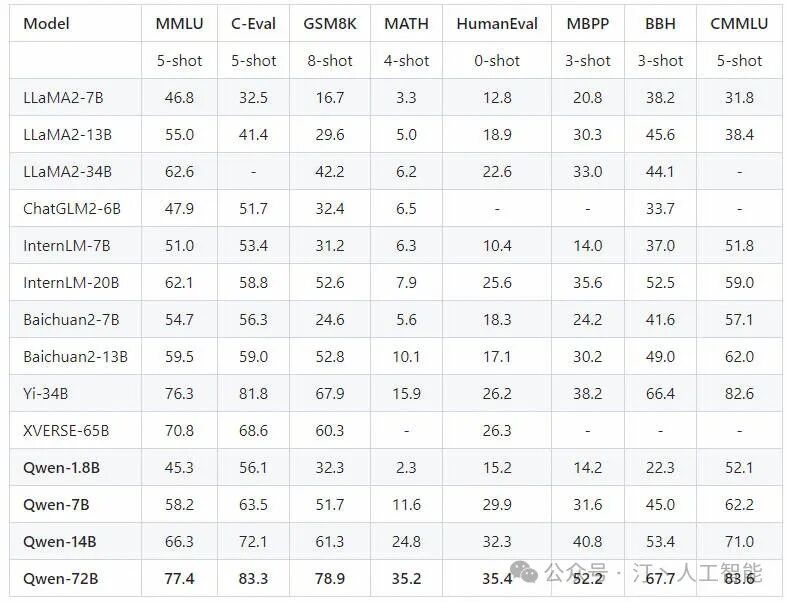 性能表现:在多个权威基准评测中取得开源模型最优成绩,证明了其卓越的技术实力和广泛的适用性,不仅超越了部分知名开源模型如Llama 2-70B,而且在与商用闭源模型的竞争中也展现出了竞争力。