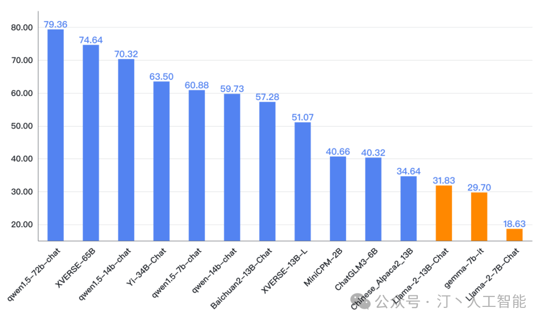 总体上大版本(如34B)的模型优于中小版本(13B、6B)的开源模型,更大的版本(如72B)的模型表现要更好。但也有小模型好于大模型的情况,如qwen1.5的70亿参数版本好于一些130亿参数的大模型,面壁智能的MiniCPM-2b好于智谱AI的ChatGLM3-6B