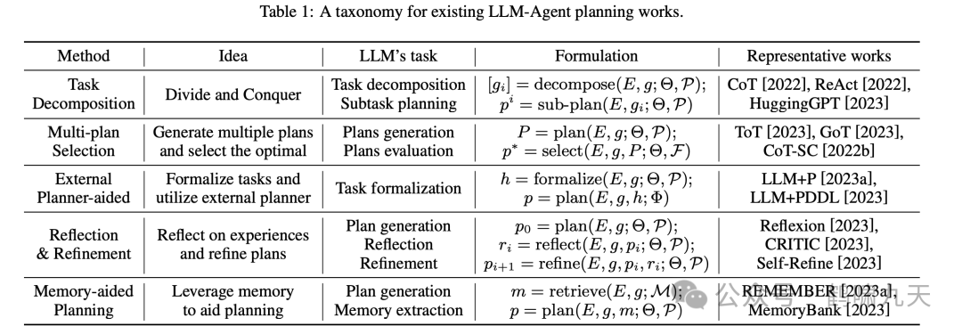 论文提出新颖的分类法,将现有 LLM-智能体规划方法分成了五大类:任务分解、多计划选择、外部模块辅助规划、反思与细化以及记忆增强规划。 任务分解: 把大蛋糕切成小块,让智能体一步步地解决。类似分治思想 多计划选择: 给智能体一个“选择轮”,生成多个计划,然后挑一个最好的来执行。类似召回、排序。 外部模块辅助规划: 借助外部规划器,有个军师在旁边出谋划策。类似强化学习的判官。 反思与细化: 执行计划过程中,能够停下来反思,然后改进计划。 记忆增强规划: 一个记忆面包,记住过去经验,为将来规划提供帮助。