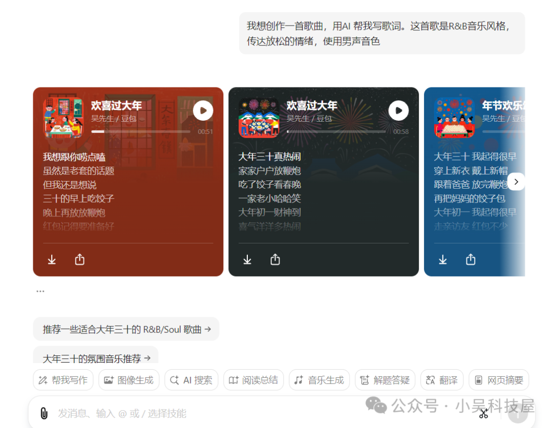 基本上上是把所有能用到的AI功能都给集合起来了,AI搜索,写作,图像生成,阅读理解,甚至可以生成AI音乐?,还有把生成视频的即梦也给集合进来了。
