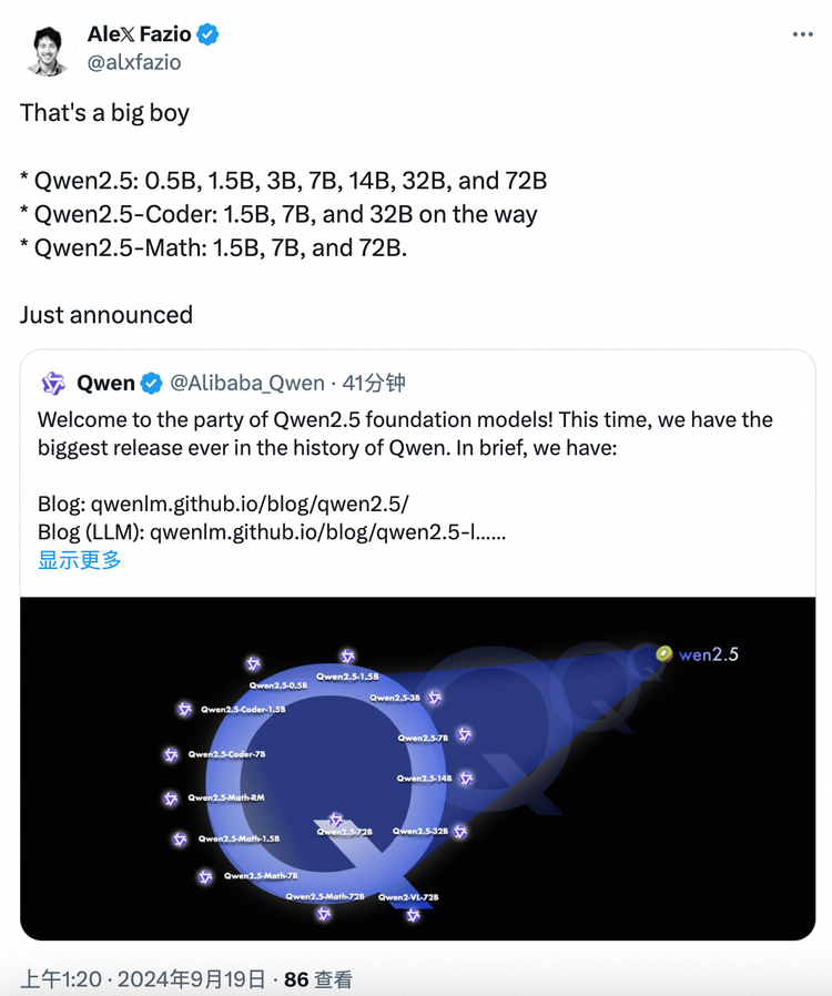 ingFang SC", "Hiragino Sans GB", "Microsoft YaHei UI", "Microsoft YaHei", Arial, sans-serif;font-size: medium;letter-spacing: inherit;text-align: start;text-wrap: wrap;background-color: rgb(255, 255, 255);"> ingFang SC", "Hiragino Sans GB", "Microsoft YaHei UI", "Microsoft YaHei", Arial, sans-serif;font-size: 16px;letter-spacing: inherit;text-wrap: wrap;background-color: rgb(255, 255, 255);color: rgb(48, 48, 48);line-height: 1.75em;">已经要睡觉的日本网友,半夜爬起来测试竞技场;ingFang SC", "Hiragino Sans GB", "Microsoft YaHei UI", "Microsoft YaHei", Arial, sans-serif;font-size: medium;letter-spacing: inherit;text-align: start;text-wrap: wrap;background-color: rgb(255, 255, 255);"> ingFang SC", "Hiragino Sans GB", "Microsoft YaHei UI", "Microsoft YaHei", Arial, sans-serif;font-size: 16px;letter-spacing: inherit;text-wrap: wrap;background-color: rgb(255, 255, 255);color: rgb(48, 48, 48);line-height: 1.75em;">甚至有人直呼今天是“疯狂星期四”!ingFang SC", "Hiragino Sans GB", "Microsoft YaHei UI", "Microsoft YaHei", Arial, sans-serif;font-size: medium;letter-spacing: inherit;text-align: start;text-wrap: wrap;background-color: rgb(255, 255, 255);"> ingFang SC", "Hiragino Sans GB", "Microsoft YaHei UI", "Microsoft YaHei", Arial, sans-serif;font-size: 16px;letter-spacing: inherit;text-wrap: wrap;background-color: rgb(255, 255, 255);color: rgb(48, 48, 48);line-height: 1.75em;">没错,一切都是因为,Qwen2.5开源了,而且一口气上架了100多个模型!ingFang SC", "Hiragino Sans GB", "Microsoft YaHei UI", "Microsoft YaHei", Arial, sans-serif;font-size: medium;letter-spacing: inherit;text-align: start;text-wrap: wrap;background-color: rgb(255, 255, 255);"> ingFang SC", "Hiragino Sans GB", "Microsoft YaHei UI", "Microsoft YaHei", Arial, sans-serif;font-size: 16px;letter-spacing: inherit;text-wrap: wrap;background-color: rgb(255, 255, 255);color: rgb(48, 48, 48);line-height: 1.75em;text-align: left;">9月19日云栖大会,阿里云CTO周靖人发布通义千问新一代开源模型Qwen2.5系列,包括语言模型 Qwen2.5,多模态模型Qwen2-VL,以及专门针对编程的 Qwen2.5-Coder 和数学模型 Qwen2.5-Math。ingFang SC", "Hiragino Sans GB", "Microsoft YaHei UI", "Microsoft YaHei", Arial, sans-serif;font-size: 16px;letter-spacing: inherit;text-wrap: wrap;background-color: rgb(255, 255, 255);color: rgb(48, 48, 48);line-height: 1.75em;">2023年8月开始,Qwen系列开始逐渐开源,不到一年内,从1.0逐步升级到2.5,完成了四次重大迭代,从今年年初到现在持续霸榜,开发者们更是将这一次开源,称为“史诗级开源”。ingFang SC", "Hiragino Sans GB", "Microsoft YaHei UI", "Microsoft YaHei", Arial, sans-serif;font-size: 16px;letter-spacing: inherit;text-wrap: wrap;background-color: rgb(255, 255, 255);color: rgb(48, 48, 48);line-height: 1.75em;">甚至网友辣评:这才是真正的“Open AI”。