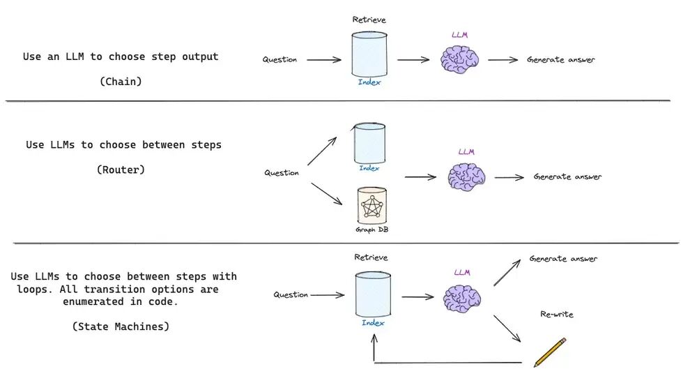 • 适应性有限:传统系统无法动态调整策略,例如选择API调用或网页搜索。